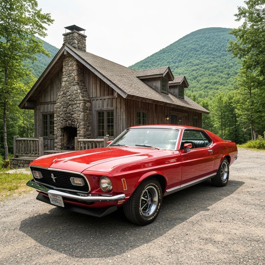 This image shows a classic 1970 Ford Mustang GT parked near a summer cabin. The muscle car is set against the backdrop of the scenic Adirondack Mountains.