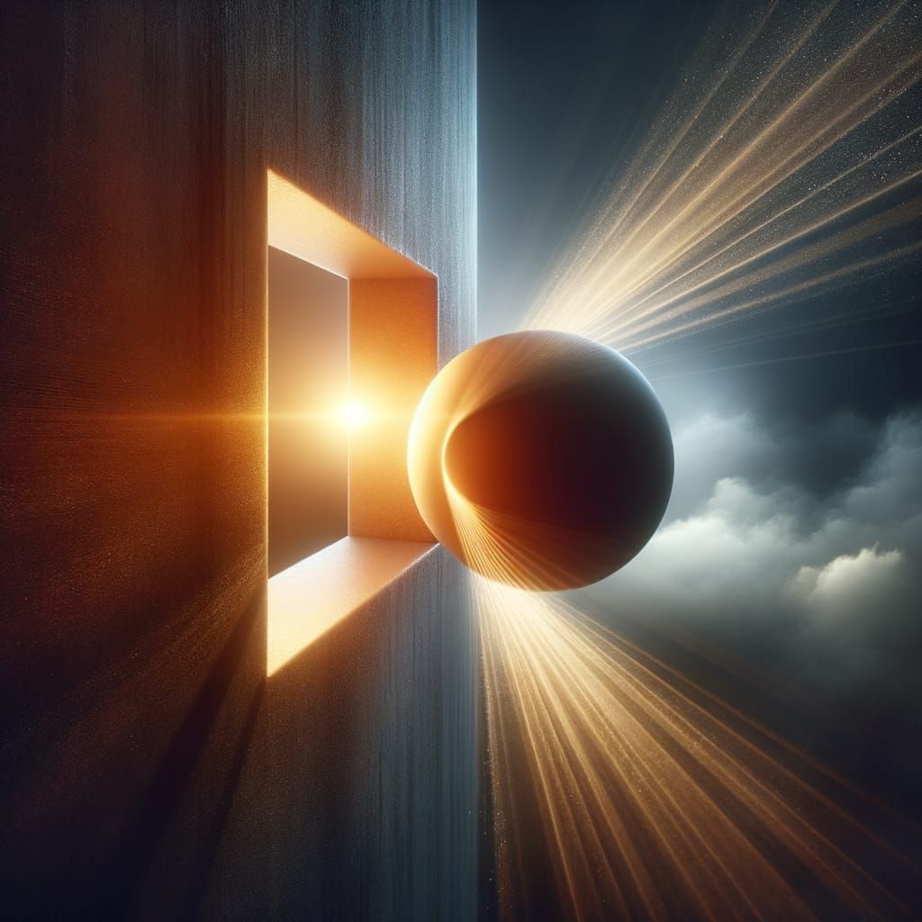 This surreal image visualizes overcoming obstacles, with a round form passing through a square opening, symbolizing the transition from darkness to light and the co-existence of impossibility and possibility.