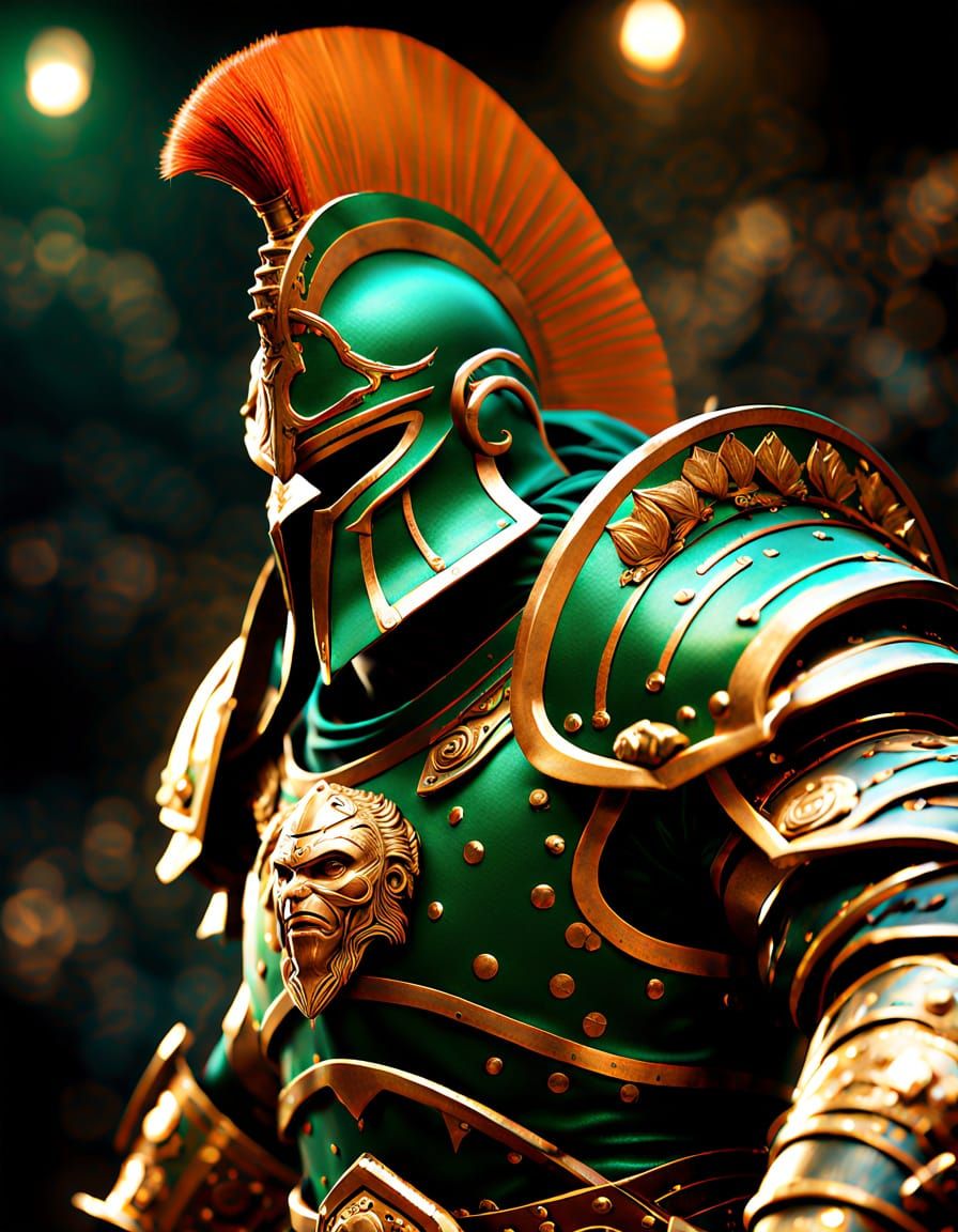 This hyper-realistic digital art showcases Talrek, the Pit-Forged Gladiator, in metallic green armor with golden accents. Set in a dark arena with low-key, warm lighting, the image is detailed and cinematic.