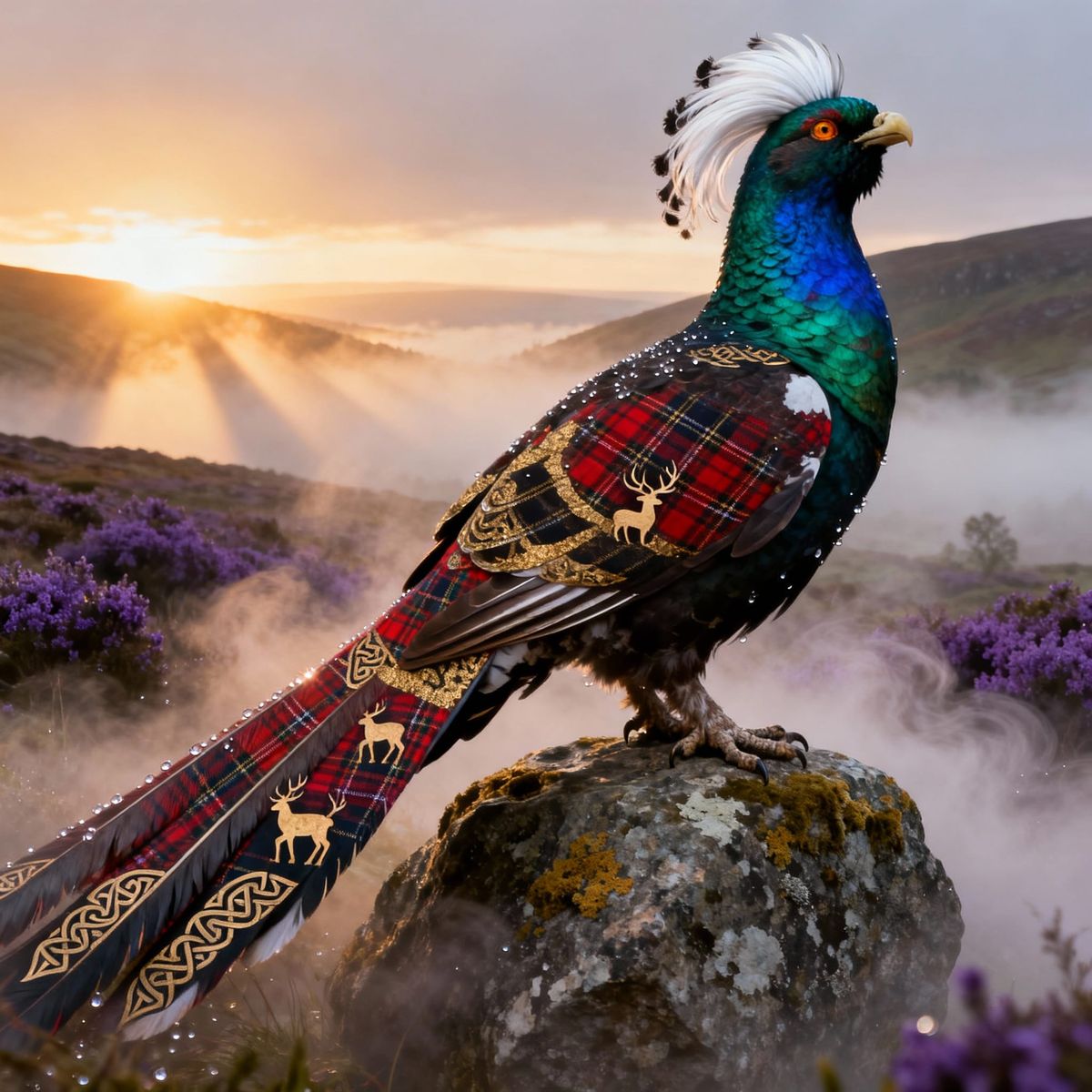 A hyper-realistic image of a majestic male capercaillie with iridescent, tartan-patterned plumage perched on a boulder in the Scottish Highlands at dawn. Cinematic atmosphere with volumetric god rays.