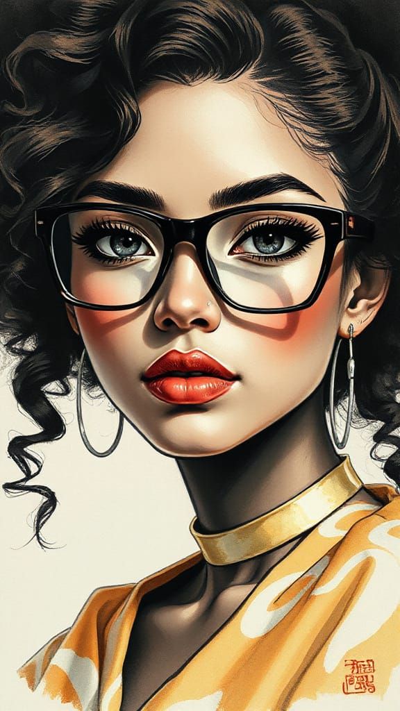 A captivating portrait of a young African woman in a fantastical setting, created in the traditional Chinese ink painting style with bold brushstrokes and subtle color nuances.