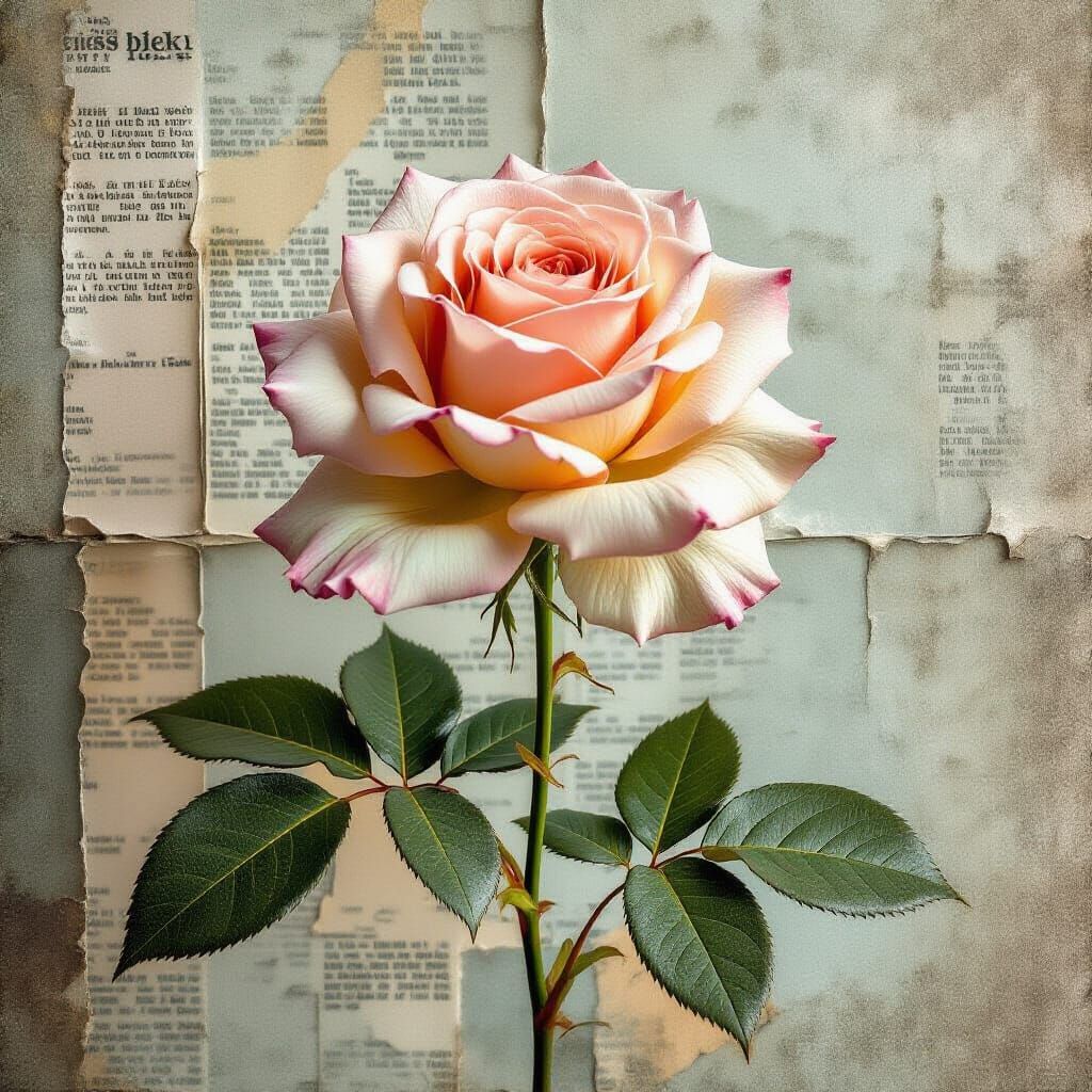This image showcases a solitary, wilting rose with frosted glass edges, set against vintage newspaper clippings. It evokes melancholic beauty with soft, flowing Art Nouveau lines and cinematic lighting.