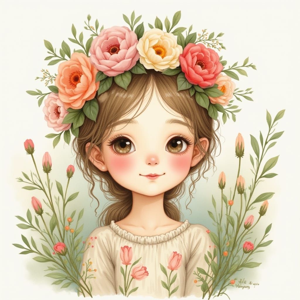 a beautiful, soft watercolor-style digital illustration of a young girl โ it has a very dreamy, delicate, and storybook feel!