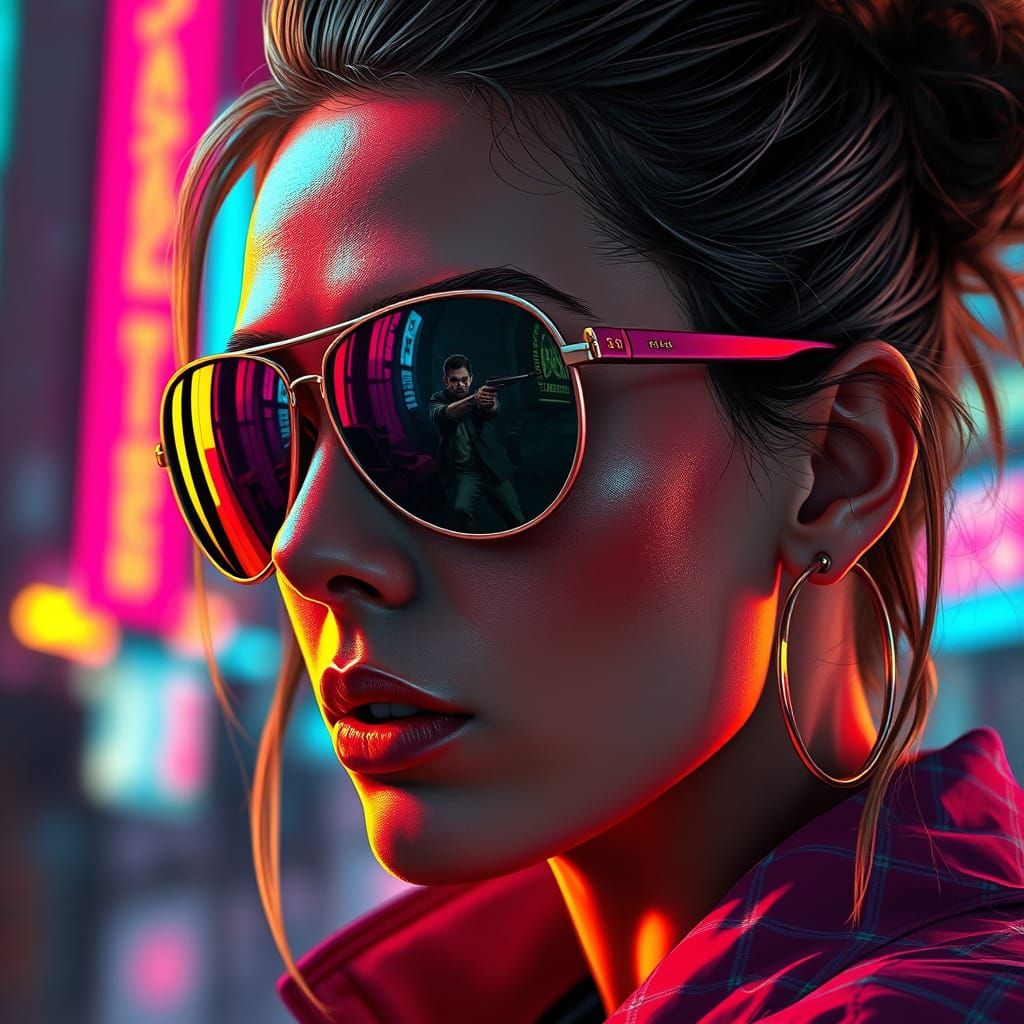 This image shows a woman in a vibrant cyberpunk world, with a dramatic, colorful background and intricate details, as she reflects on a chaotic gunfight scene through her mirrored glasses.