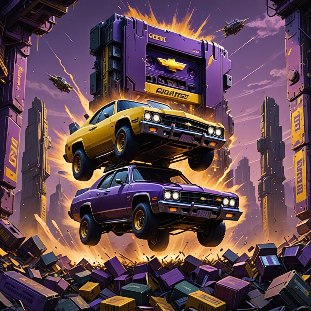 This image shows a classic Chevrolet car leaping over a pile of oversized cassette tapes. The artwork features dynamic lighting, intricate details, and a dark fantasy aesthetic with purple and yellow hues.