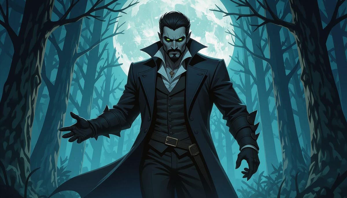 This image shows a tall, lean vampire with dark hair, mustache, and beard, partially transforming into a wolf in a sinister, moonlit forest. Rendered with dynamic brushstrokes and dramatic lighting.