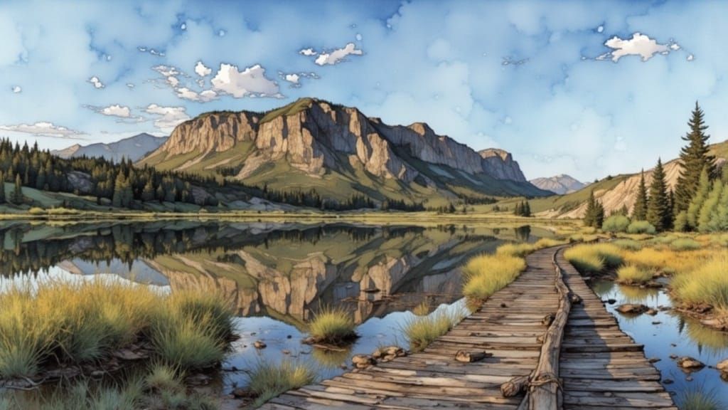 This image shows a peaceful creek in the Wild West bathed in golden light. The scene features lush plants and weathered wood, rendered in watercolor with comic book-inspired colors.
