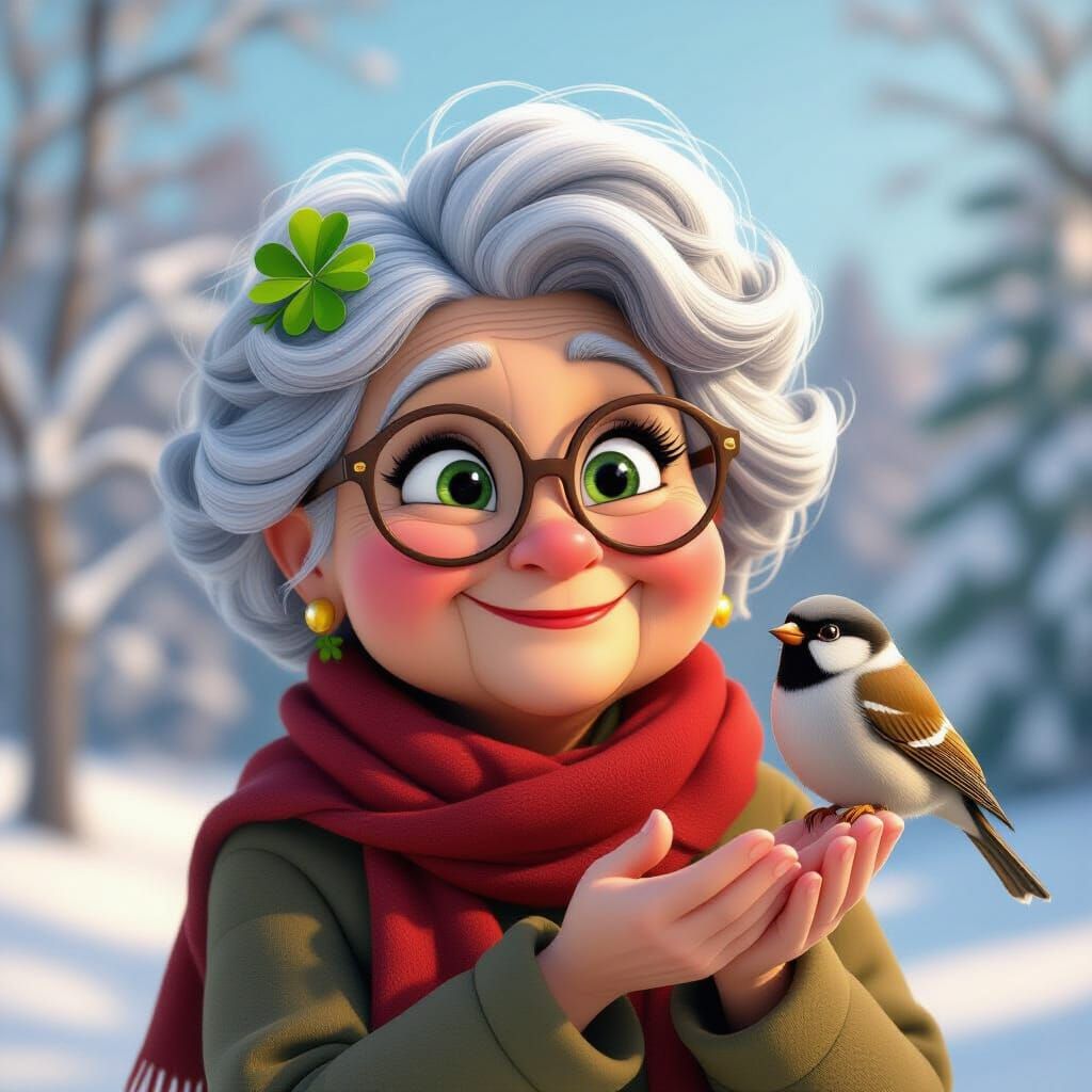 A charming image of a cheerful grandma in winter attire, with a sparrow perched on her hand. Rendered in a bright, colorful, and cinematic 3D digital art style.