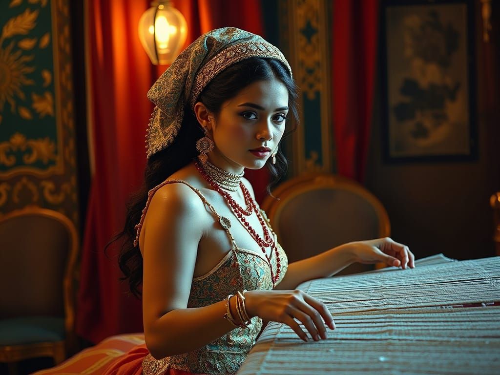 This image features a beautiful loom weaver bathed in warm, sensual light. Rich jewel tones and gold accents create a maximalist splendor in a detailed digital painting style.