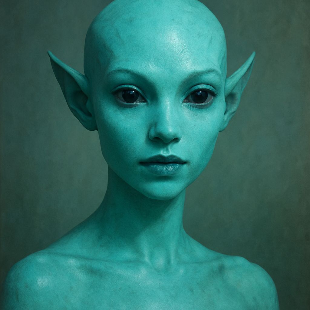 This image shows a humanoid alien woman with aqua skin. The AI generated image depicts a serene and otherworldly figure.