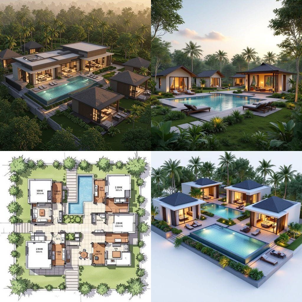 Create unique cottage and villa designs with our free AI tool. Plan your perfect home, from 1BHK to spacious villas and pools.