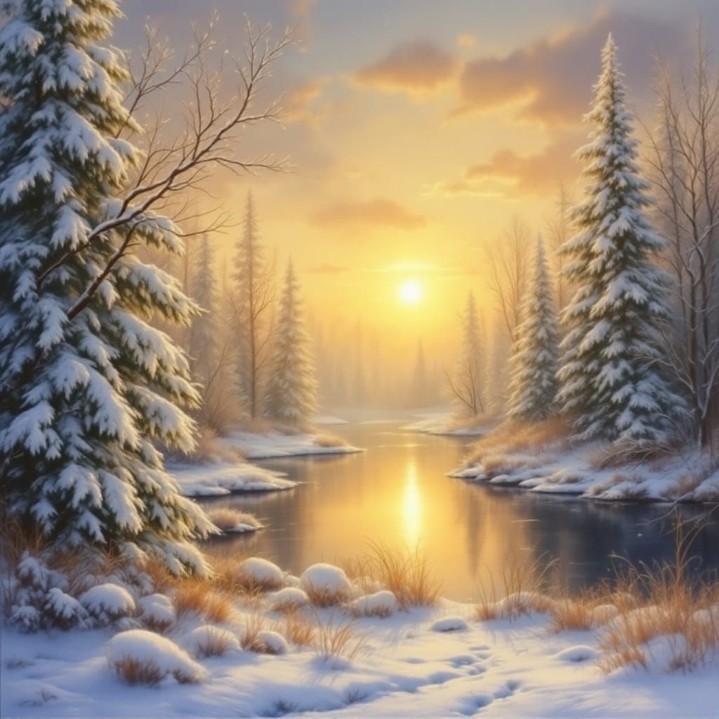 A whimsical painting of a magical glade in an enchanted winter forest. The scene features snow-covered trees and a serene sunrise over a lake, all rendered in watercolor and airbrush pastels.