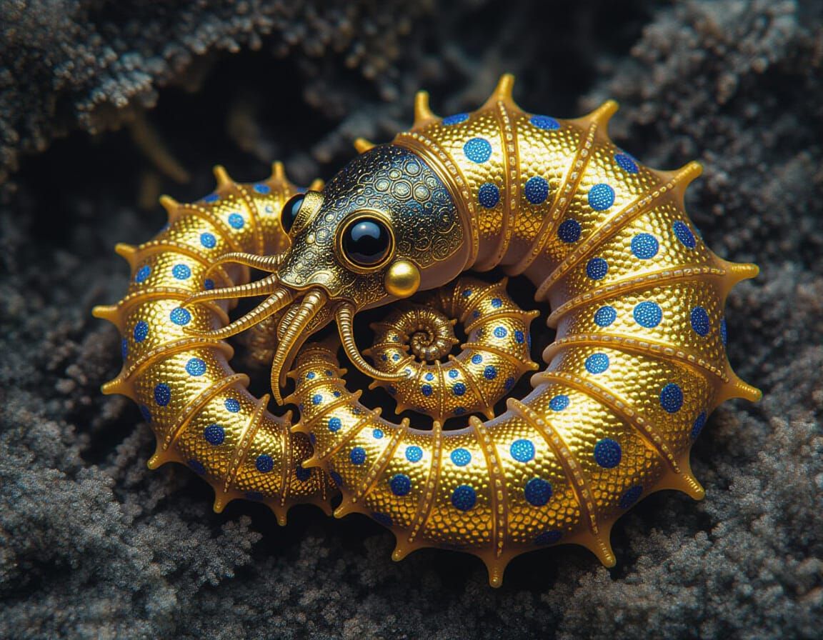 A striking picture of a golden, scaled creature resembling a lobopodian, guarding its young. The image features intricate textures, metallic iridescence, and dramatic lighting reminiscent of chiaroscuro.