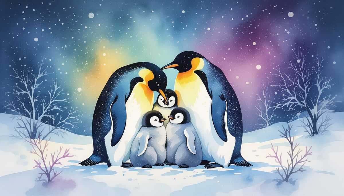 This image shows a family of penguins huddling together in a snowy winter scene. The artwork has a grunge, glitchy, vibrant, and sinister punk aesthetic with colorful ink wash effects.