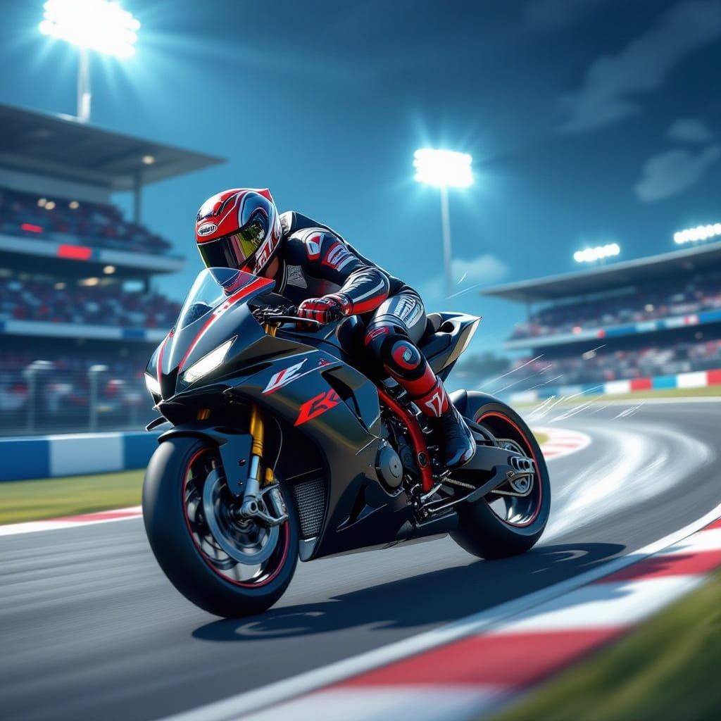 This digital painting shows a focused motorcyclist aggressively leaning into a sharp turn during a race. Vivid colors and strong contrasts capture the thrill of speed and intense competition.