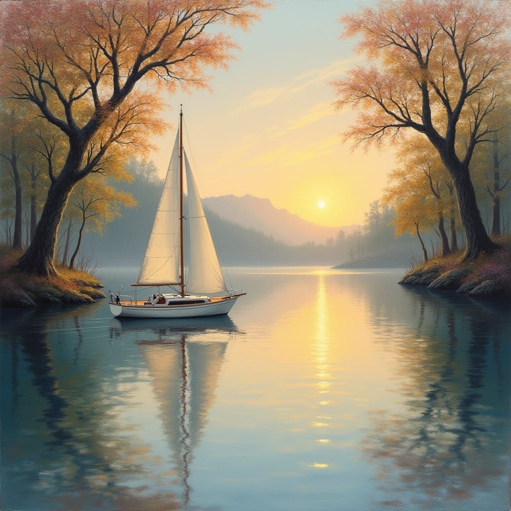 This image depicts a tranquil lake scene with a small white sailboat reflected in the calm waters, surrounded by vibrant autumn trees and a warm golden light of sunset, reminiscent of Impressionist art with soft brushstrokes and pastel colors