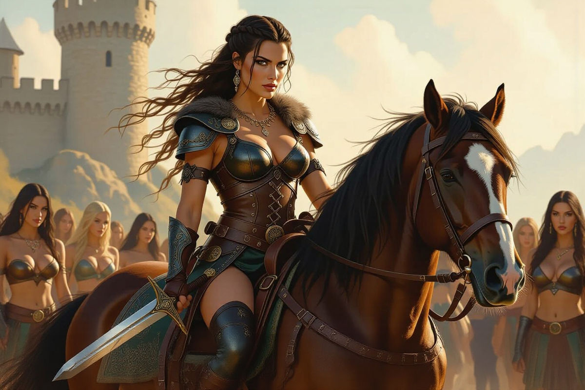 A fierce Viking woman in a leather bikini rides a majestic Clydesdale horse, surrounded by other warriors. Dramatic sunlight illuminates the scene before a medieval castle, in the style of Frank Frazetta.