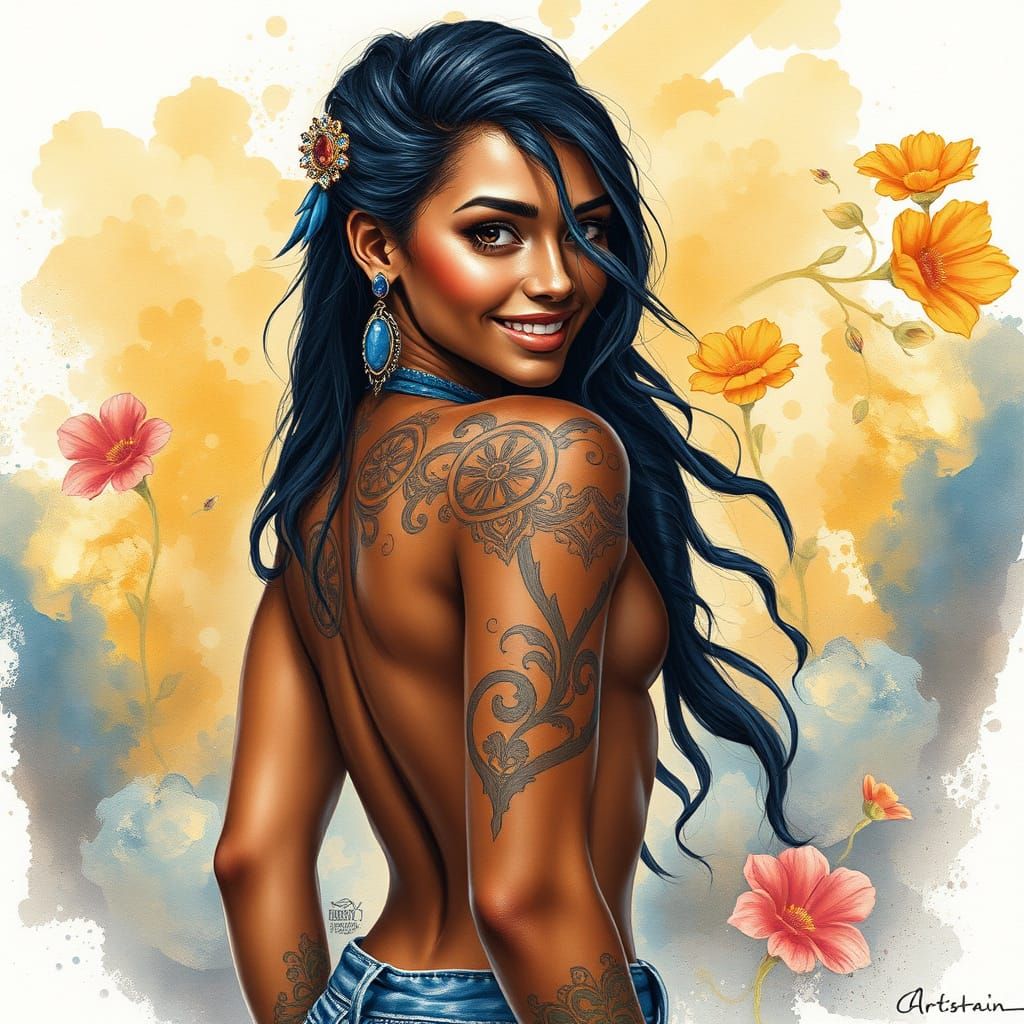 This captivating watercolor painting depicts Ishtar, the stunning Queen of Heaven and Earth, with her dark tan skin and brown eyes radiating beauty. She exudes confidence, showcasing her athletic physique and intricate floral tattoos as she turns towards the camera with a charming smile, adorned with lap...