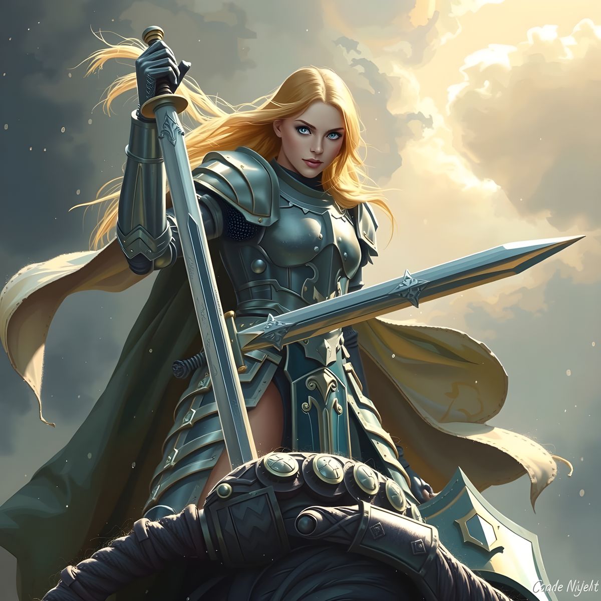 A heroic fantasy image of a blonde female knight in metallic armor, standing triumphantly with sword raised, surrounded by vibrant colors and dramatic lighting reminiscent of classic fantasy art.