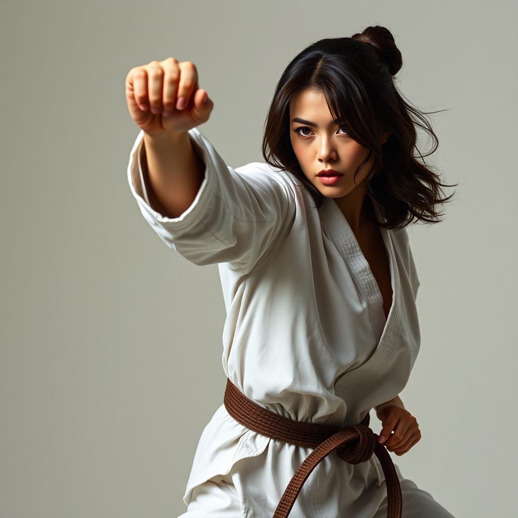 A realistic image of a blonde female karateka in a dynamic fighting pose, wearing a karate uniform. The artwork evokes photorealistic styles.