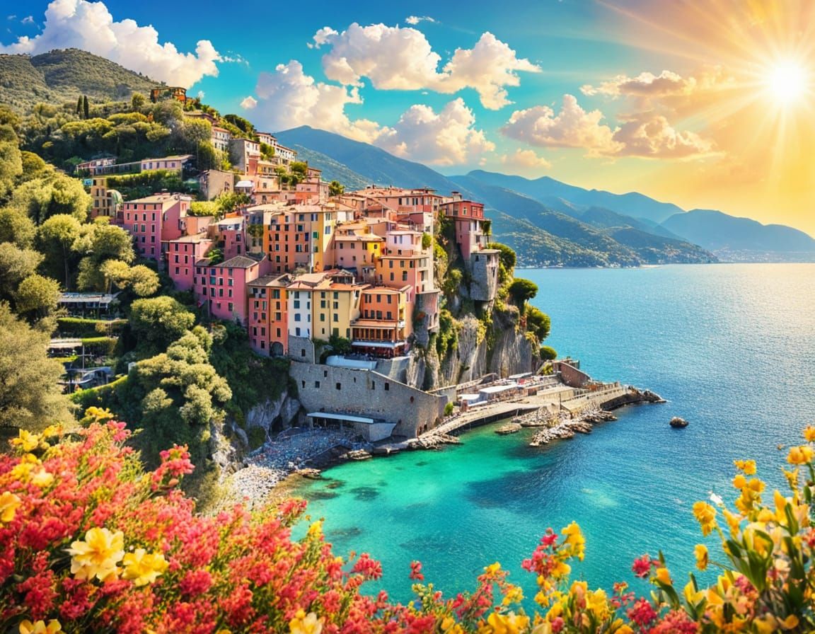 A vibrant image of the Italian Riviera under a multicolored sky. The scene captures the essence of a sunny day with boats dotting the coastline.
