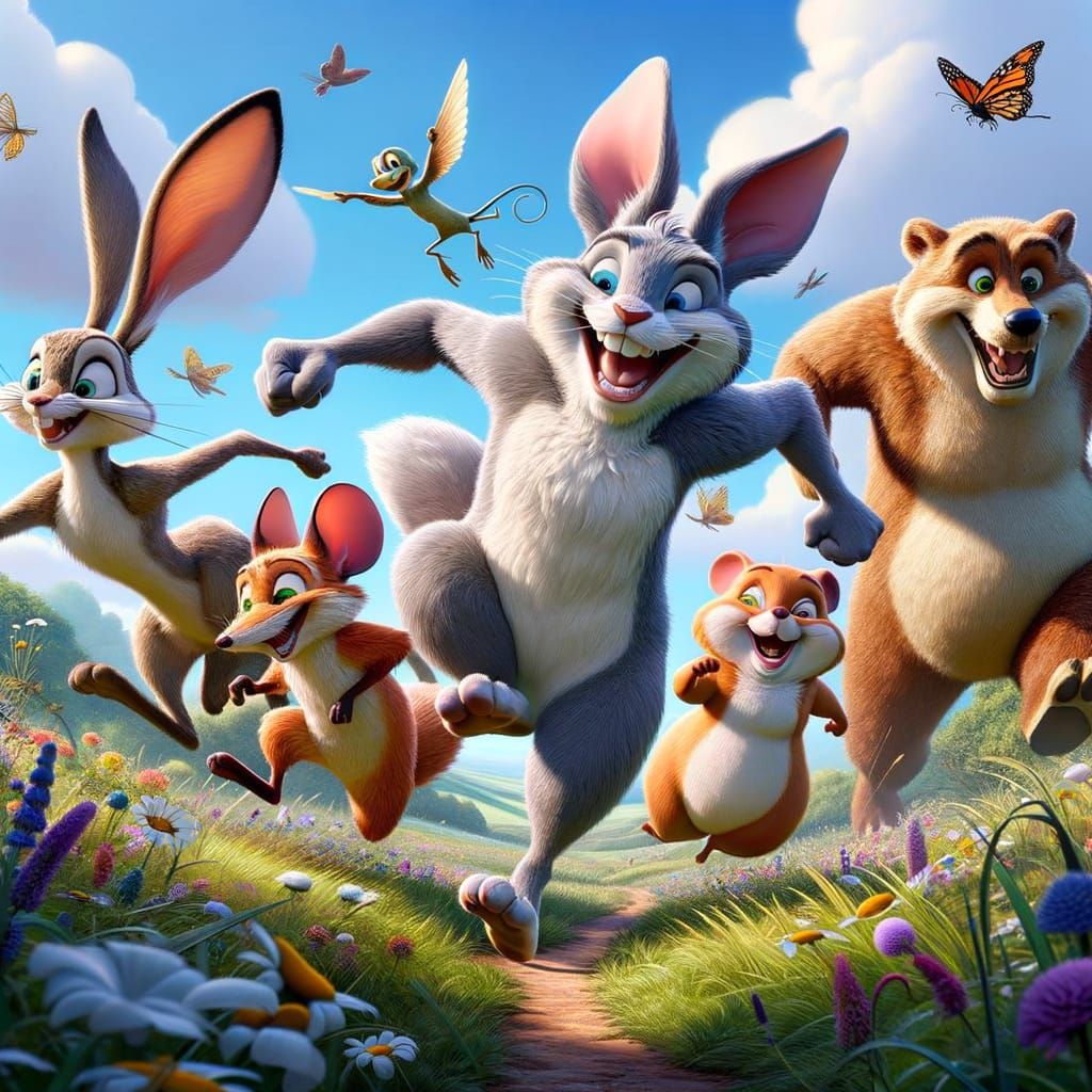 This vibrant image captures a playful array of anthropomorphic animals in a lush meadow, chasing each other under a sunny sky with wildflowers and butterflies adding to the cheerful atmosphere, reminiscent of classic animation with a unique twist