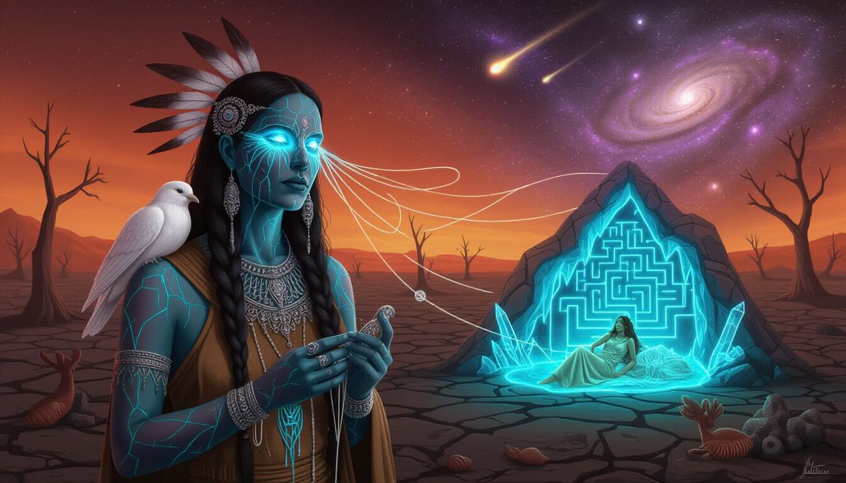 This image shows a mystical shaman with a cracked, earthen skin revealing bioluminescent fluid, set against a barren, ash-filled world under a copper sky. Features include interwoven birds, music labyrinths, and cosmic elements, presented as photographic experimentation.