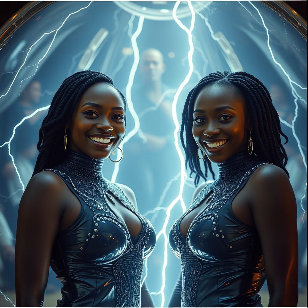 A cinematic still of two smiling Black women in latex outfits enclosed in a glass sphere amid lightning. The image features high-contrast lighting and a subtle film grain in a dramatic atmosphere.