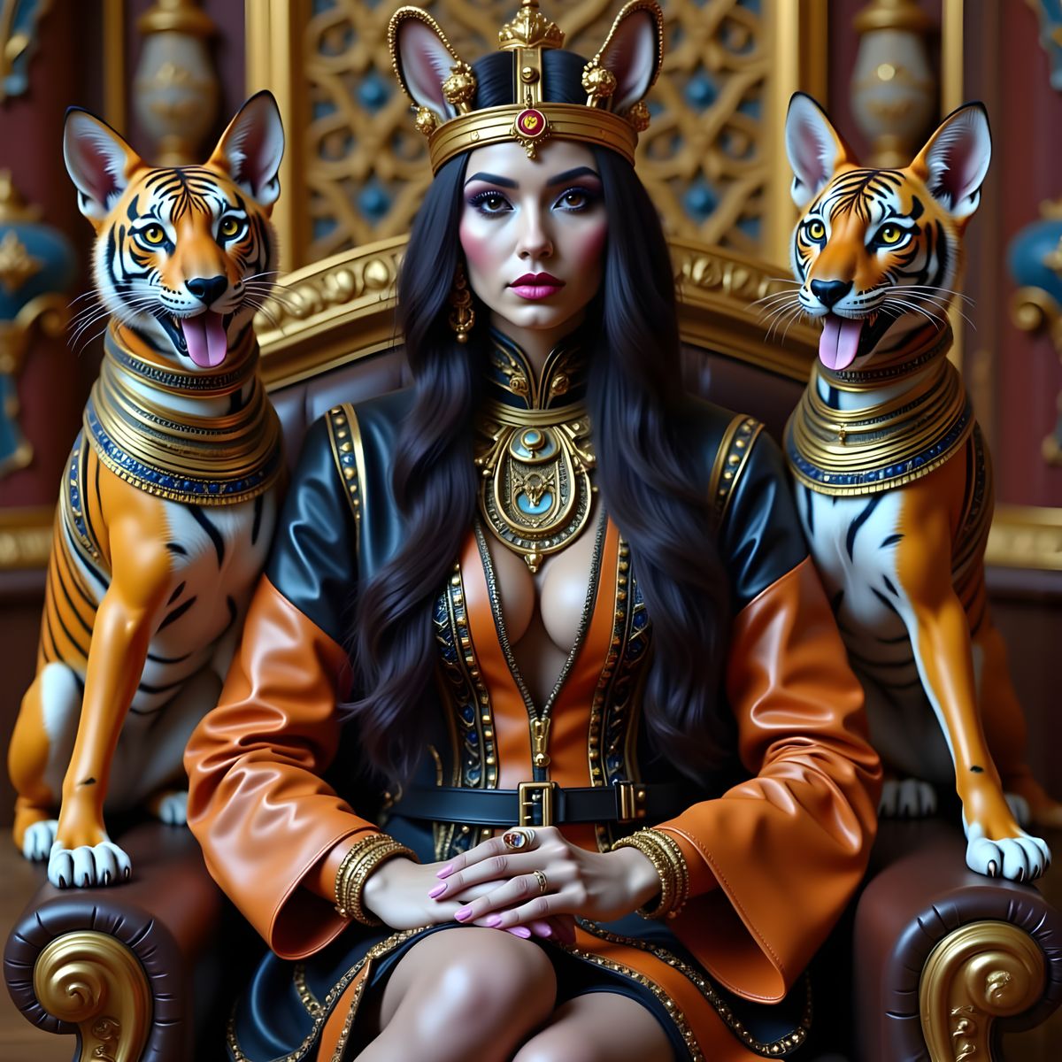 A portrait of a tigress queen in a leather outfit seated on a throne. The throne is carried by dogs in an Egyptian pharaoh style, creating a regal and exotic scene.