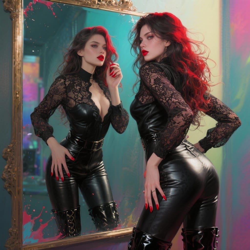 A hyperrealistic image of a beautiful woman with long hair, red lips, and nails, wearing leather pants and boots, checking her reflection. Features detailed splash art style and dramatic lighting.