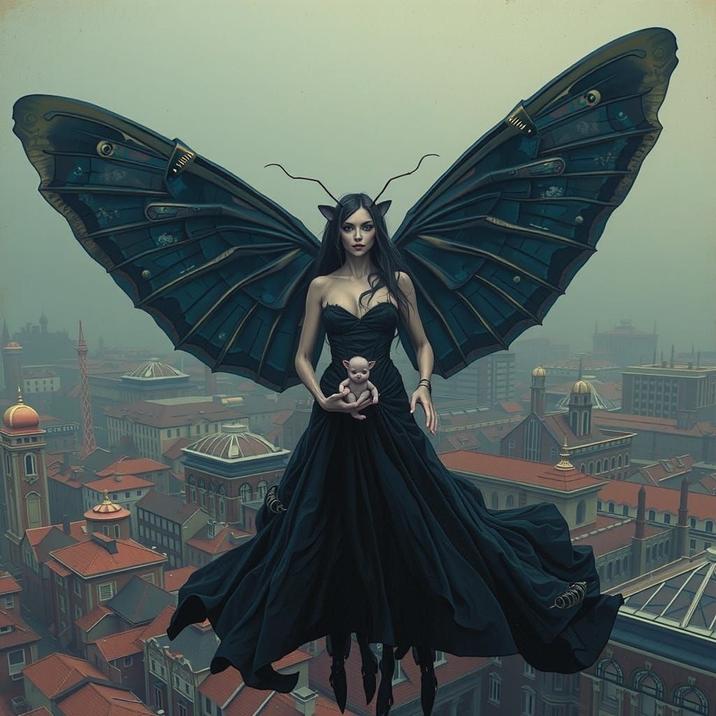 This image shows a moth-like humanoid figure with six limbs and large wings, cradling a half-caterpillar baby above a misty city. The artwork evokes a dark, surreal, biomechanical aesthetic.