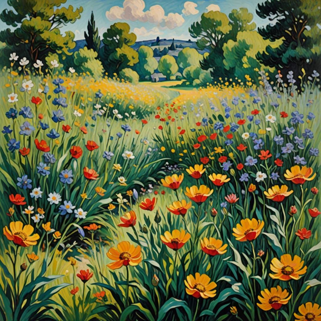 Easily create your own wildflower meadow images with our free AI image generator, perfect for neo-impressionist and expressionist art styles.