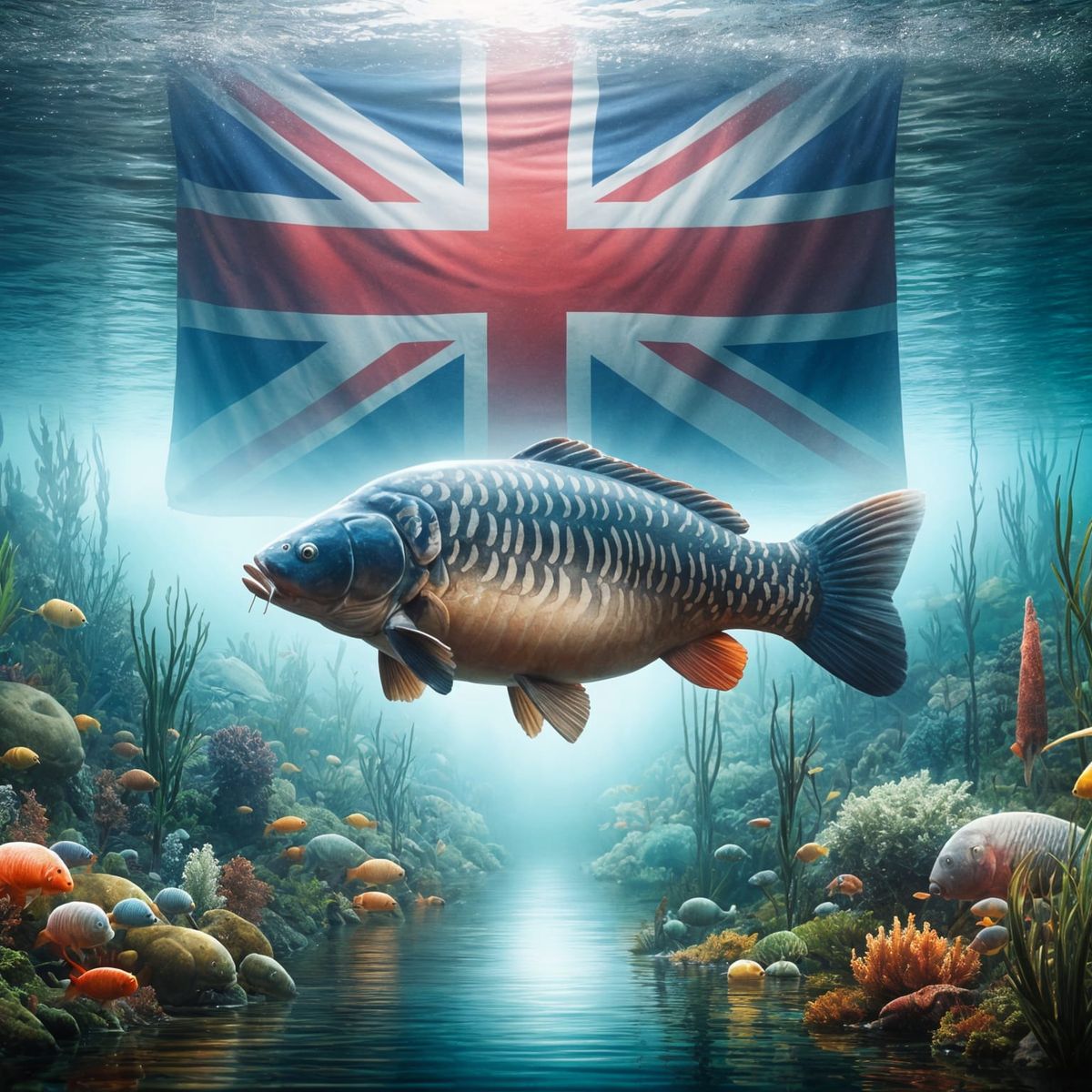 An underwater scene featuring a large carp fish majestically swimming in the aquatic surroundings. The water around the fish is serene, depicting the tranquil life within the water bodies. In the background, the flag of Great Britain gracefully floats, bringing an unexpected burst of vibrant colors - ...