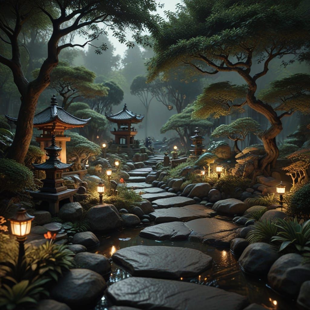 A matte painting showing animated figures in relief on various materials within a Japanese garden. Kinetic sculptures and dramatic lighting create a dynamic, detailed scene with soft bokeh.