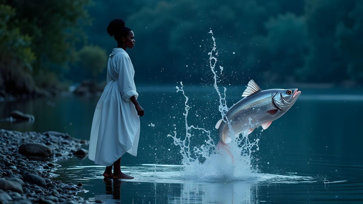 This image shows an African woman in a white robe standing by a dark river as a chrome-silver fish leaps from the water. The artwork is rendered as hyperrealistic splash art.