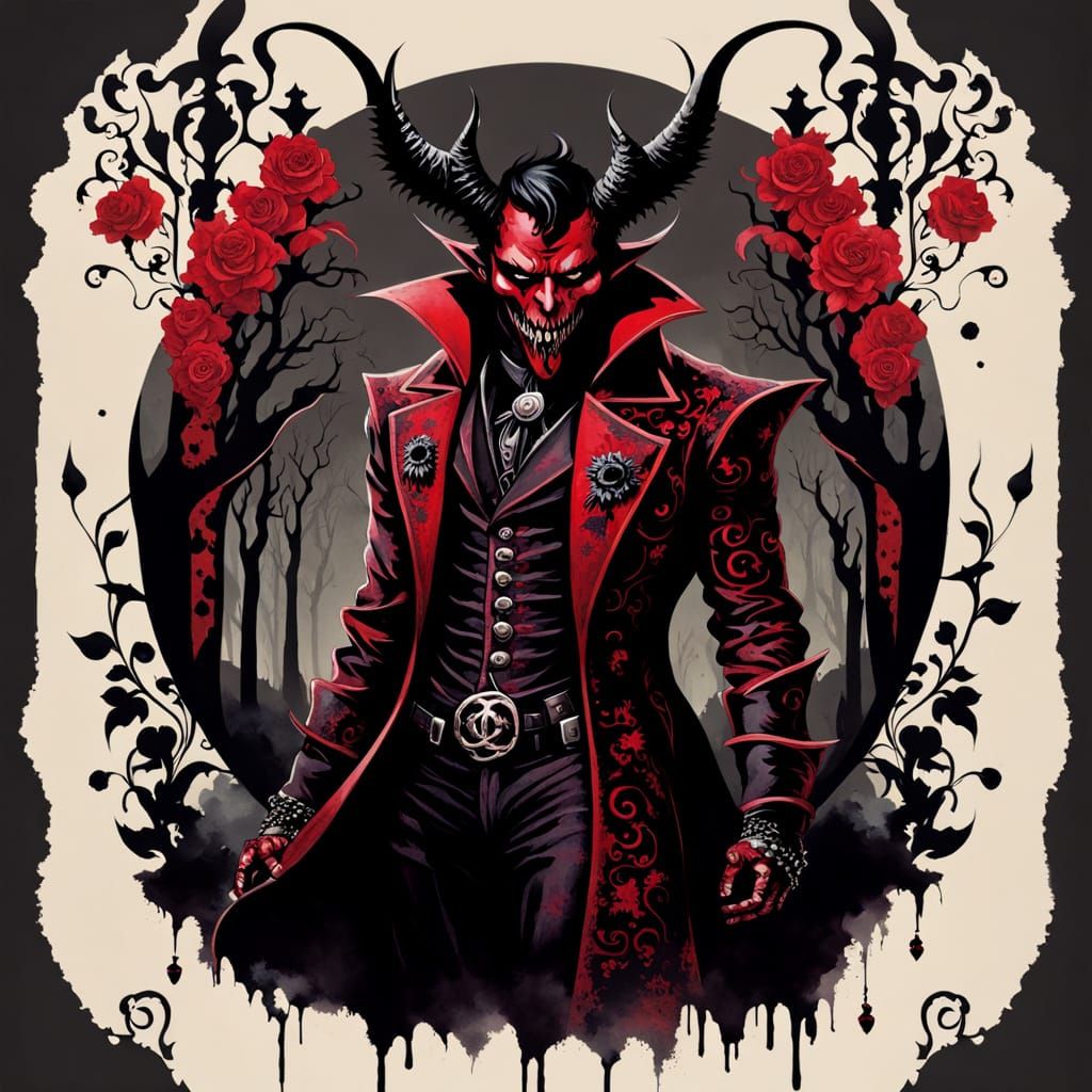 This image is a watercolor illustration of a male demon in a vintage, storybook style, featuring a Chanel logo and intricate, dark details.