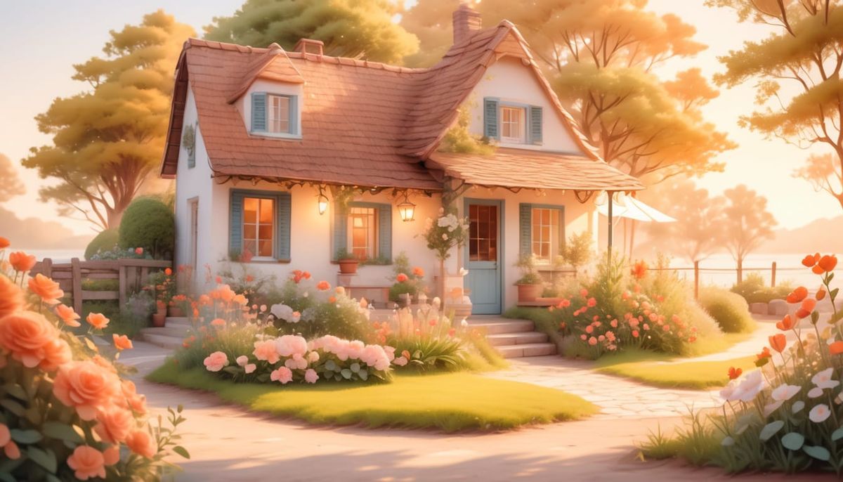 This idyllic watercolor illustration depicts a charming country cottage standing by the sea, surrounded by a lush flower garden and vibrant greenery. Soft pastel colors and gentle brushstrokes evoke a serene and tranquil atmosphere.