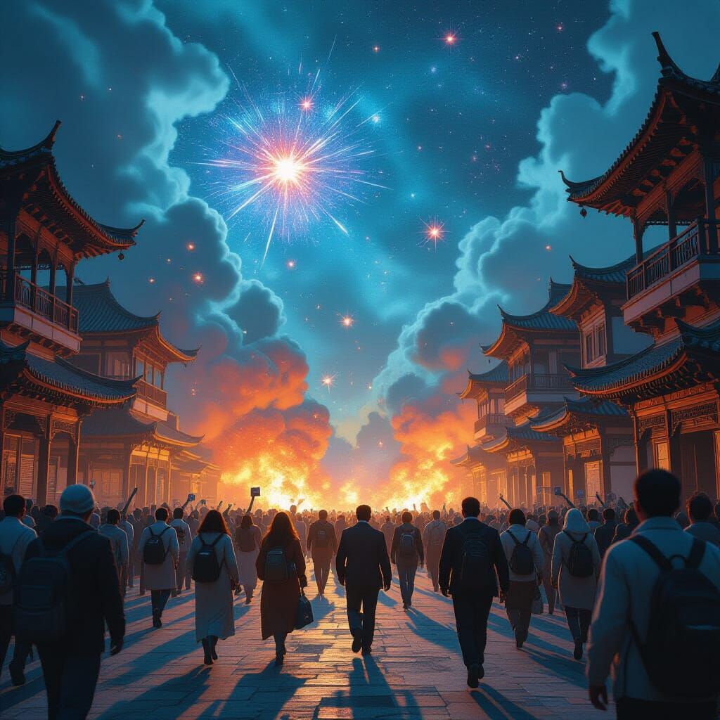This image depicts a crowd escaping bombing attacks, rendered in a detailed matte painting style with deep colors and intricate fantasy elements, resembling a splash screen.