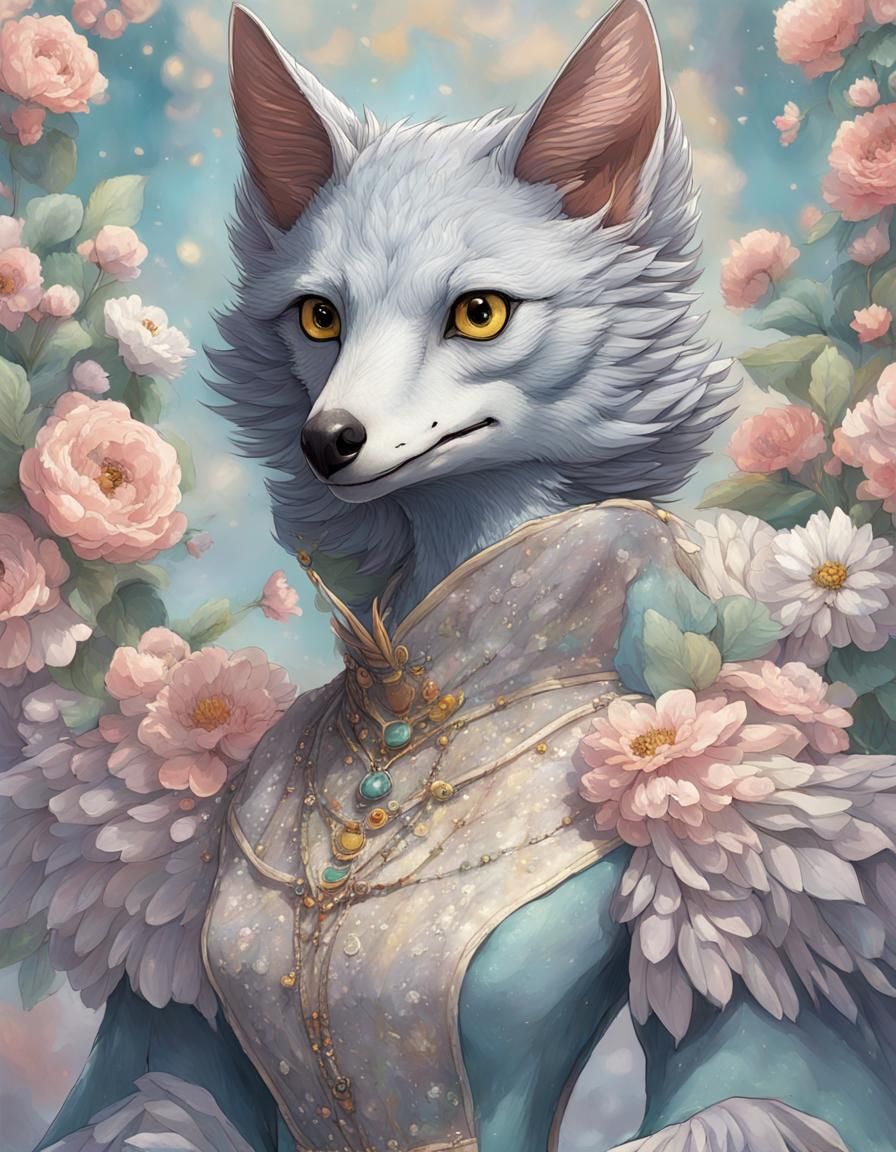 This image shows a heavily detailed, sensual anthropomorphic dove. The full body shot features a strong, furry female in a flowing pastel dress in an anime style.