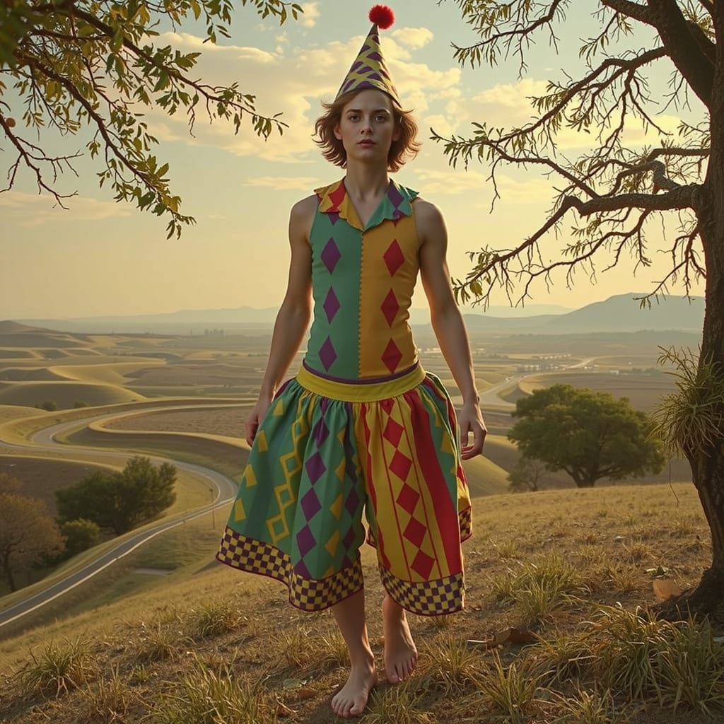 This image shows a harlequin figure camouflaged within a hypnotic, geometric maze. The figure and background blend in an optical illusion using vibrant vermillion, yellow, green, blue, and violet colors to create a photorealistic, hyperrealist aesthetic.