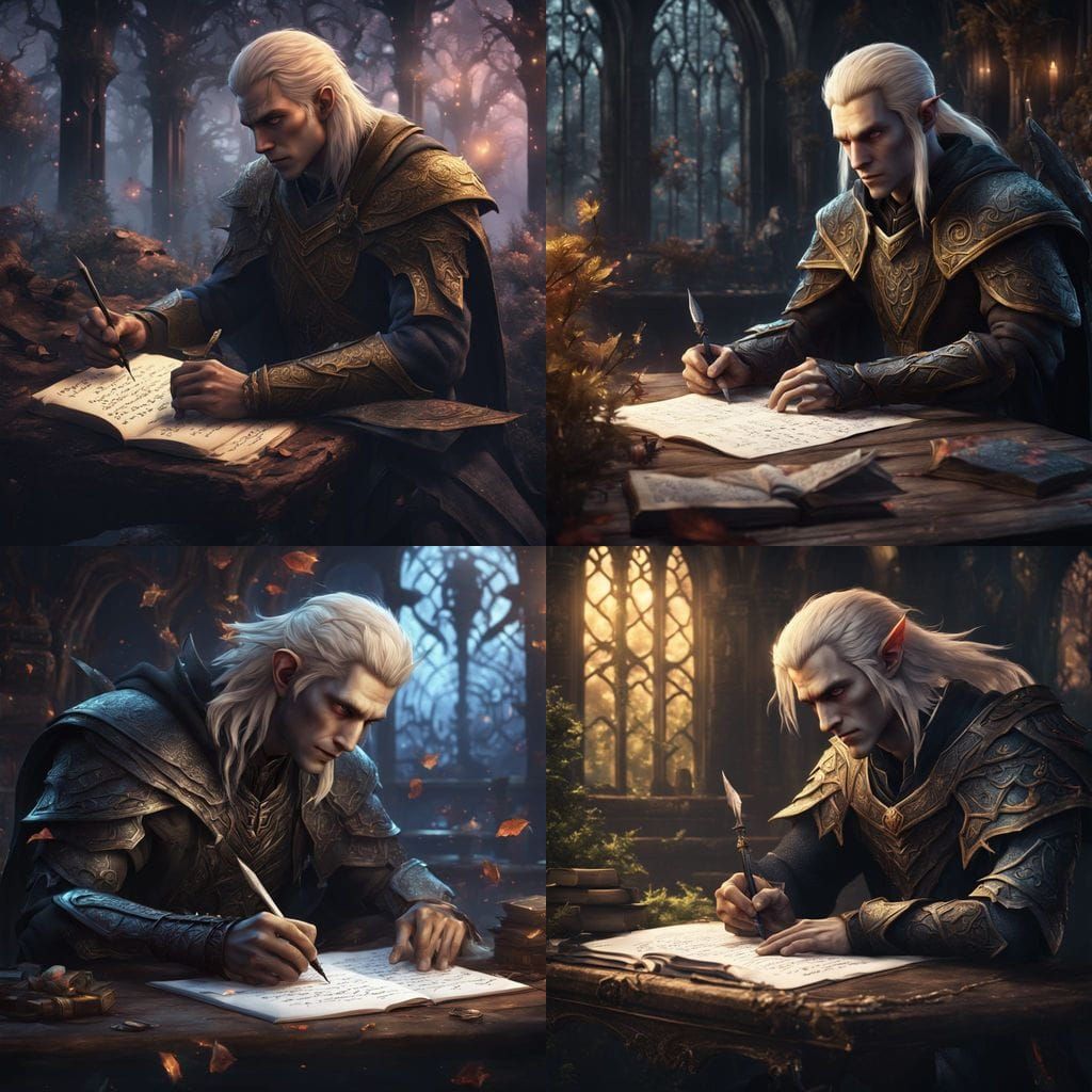 This image showcases a young half dark elf man, lost in thought as he writes a poem for his beloved. Rendered in stunning 8k resolution, this fantasy concept art piece is a masterpiece of intricate detail and deep, rich colors, evoking a sense of wonder and magic.