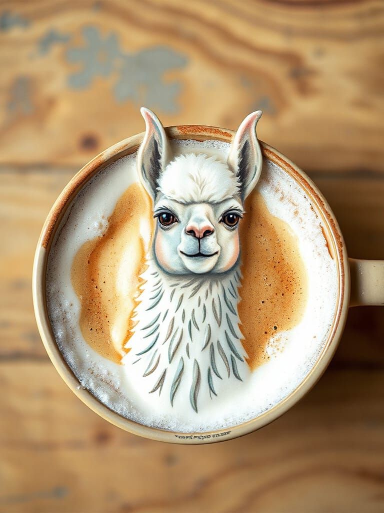 A vibrant, full-color llama design rendered in milk foam, resting inside a coffee mug. The image is reminiscent of whimsical digital art with playful textures.