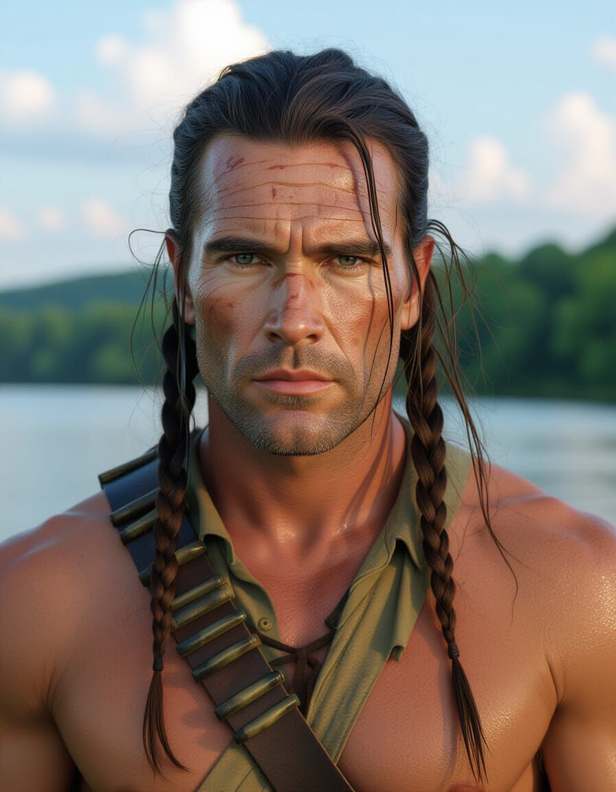 A hyperrealistic portrait of a shirtless man, reminiscent of a character from The Last of the Mohicans. The image features intricate details, dynamic lighting, and a vibrant splash art background.