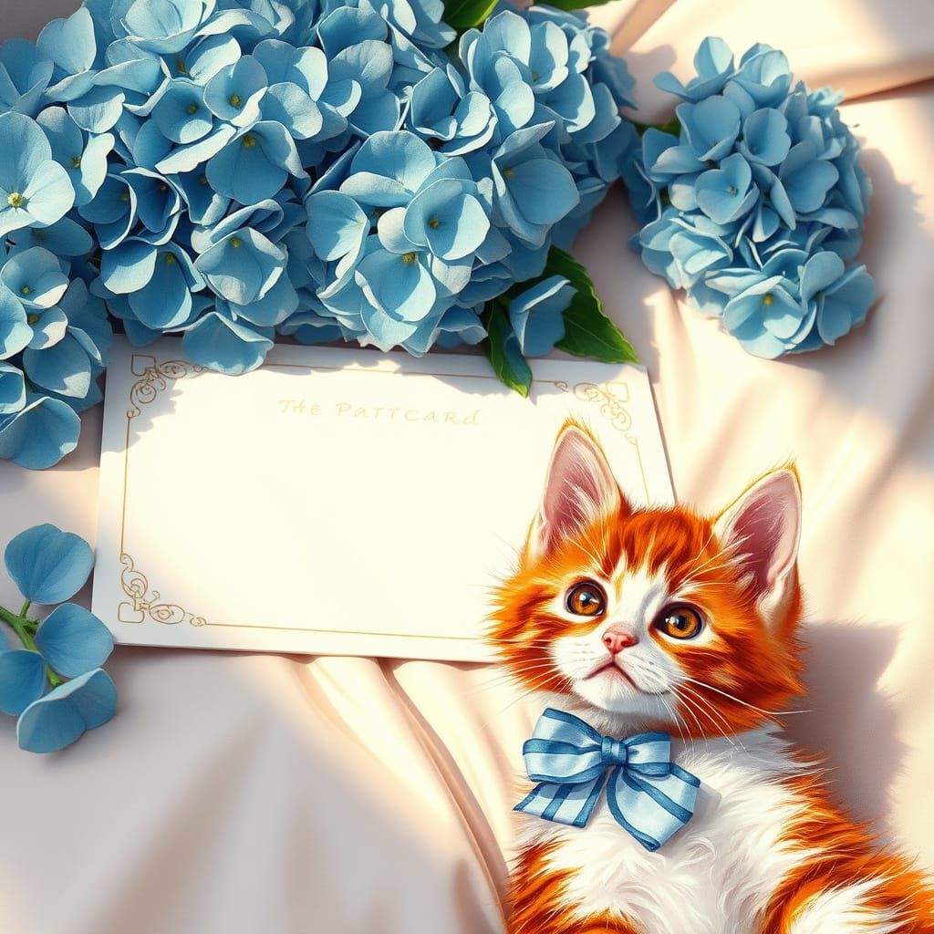 This enchanting still life features delicate, dreamy watercolor hydrangeas softly blurred by warm sunlight, amidst pastel hues and gentle textures, alongside a pristine white postcard with ornate patterns and a curious red-and-white kitten in vibrant graffiti art style with bold brushstrokes and polychro...
