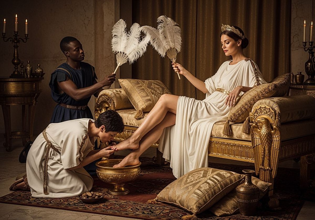 This image shows a Roman Empress relaxing in her private chamber, attended by servants. Captured with professional photography techniques, the scene emphasizes luxury and opulence.