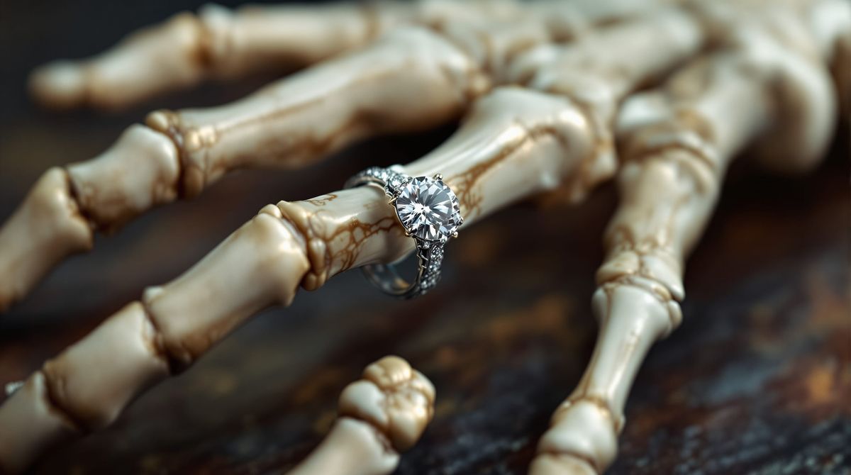 This image features a stunning, brilliant engagement ring placed on the ring finger of a skeleton. A striking visual combining romance and mortality.