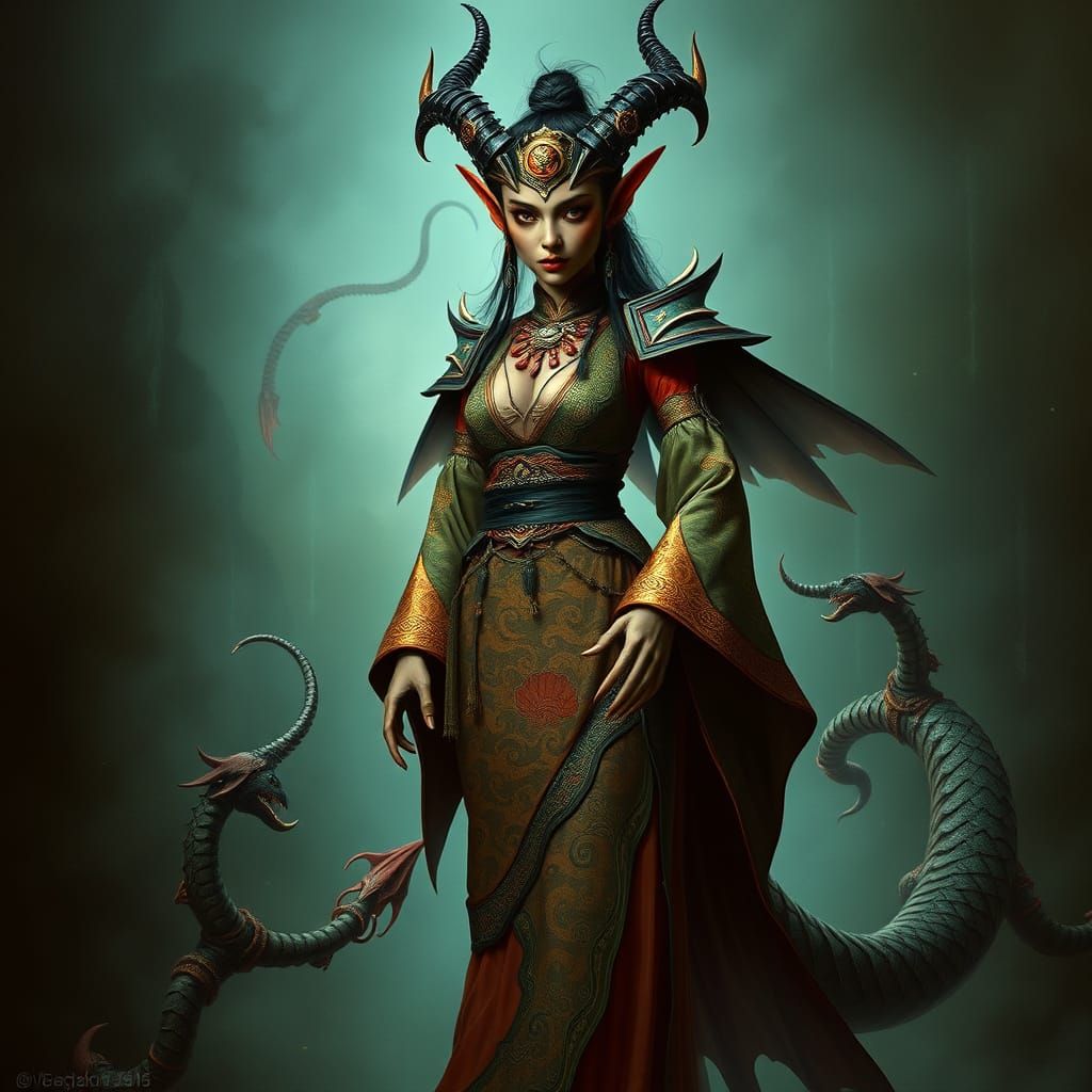 A striking picture of an Asian demon woman in traditional clothing with a dragon tail. The image, set in a mystical atmosphere, showcases dark, eerie, and mystical elements.