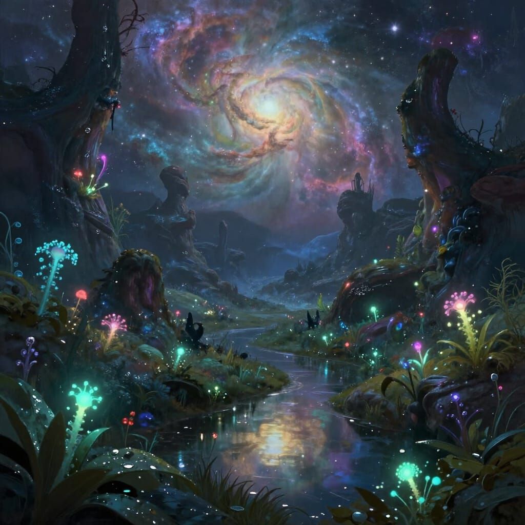 This image depicts an otherworldly valley of glowing plants and unique rocks under a celestial nebula. The scene features soft, reflected light and painterly textures, reminiscent of fantasy concept art.