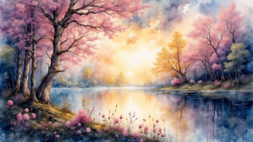 This image depicts a tranquil lake surrounded by enigmatic trees, set against a vibrant morning sky. The artwork features intricate details and a traditional watercolor aesthetic.
