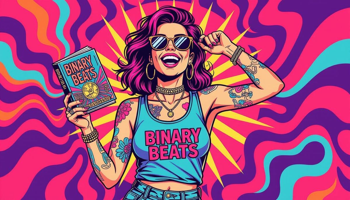 This image shows a young woman in 80s hip-hop clothing, including a cyberpunk tank top. She is holding a book against a vibrant backdrop in a surreal art deco style.